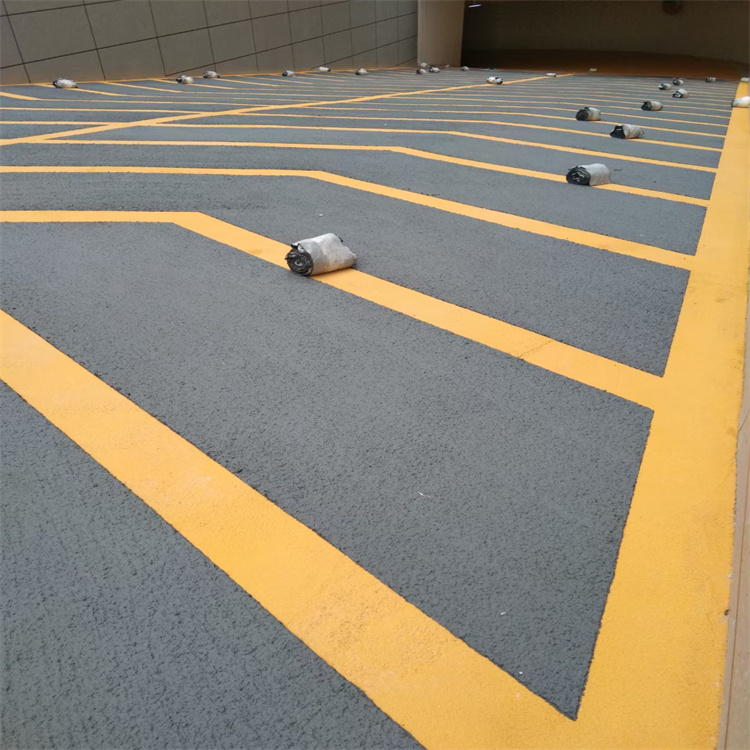 鴻坤防滑坡道材料屬于聚合物砂漿材料,水性環保,施工簡單,施工人員和使用人員都很友好。無震動防滑坡道施工分為打底、批刮黃色抗壓層、貼美紋紙、批刮綠色止滑層和罩面幾個步驟,整體厚度在5-6mm左右,表面的粗糙顆粒形成一定的防滑效果,不僅有安全防滑的功能,還有導向箭頭,對車輛行駛有引導作用。